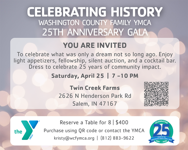 The Washington County Family YMCA invites community members, partners, and supporters to celebrate 25 years of strengthening community at its upcoming 25th Anniversary Gala, held April 25 from 7:00–10:00 PM at Twin Creek Farms, located at 2626 N. Henderson Park Rd.